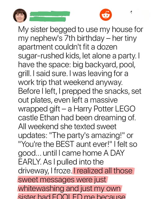 When my sister Sue asked to use my house for her son Ethan’s seventh birthday party, I agreed without hesitation, even though I’d be out of town for work. I stocked the kitchen with snacks, left out party supplies, and even bought Ethan a special gift: the LEGO set he’d been dreaming of. Sue’s grateful texts throughout the weekend made me feel like the best aunt ever. But when I got home early, my excitement turned to confusion. A sagging pink balloon arch and glittery decorations covered my yard — nothing like a kids’ party. Then I saw the banner: “Congratulations! Jessica’s Baby Shower!”
