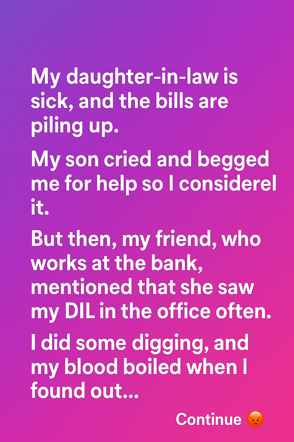My daughter-in-law is sick, and the bills are piling up. My son cried and begged me for help, so I considered it. I’ve always done my best to support my family, and watching them struggle broke my heart. I was ready to give them a large sum of money when a friend, who works at the bank, casually mentioned that she saw my daughter-in-law there often.