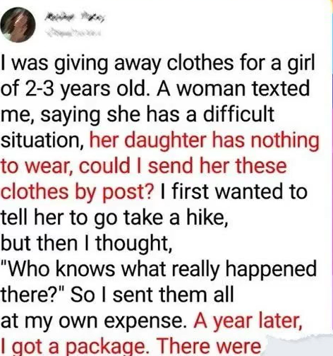 Months passed, and life moved on. Then, a year later, a package arrived at my doorstep. Confused, I opened it and found a neatly folded set of clothes — the very ones I had sent, along with a heartfelt note. The woman explained that her situation had improved. She’d found a job, and now she wanted to pass the kindness forward by returning the clothes so another child could benefit.