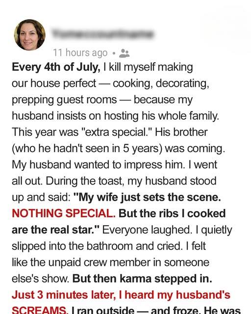 Every year, Leona poured her heart into preparing the Fourth of July celebration, handling every detail from the food to the decorations. Her husband Joel, however, loved to take the spotlight, boasting about the party as if it were his creation. This year was even more important to him, with his brother Miles visiting, and once again, Joel leaned on Leona to make everything perfect while planning to showcase only his barbecue ribs.
