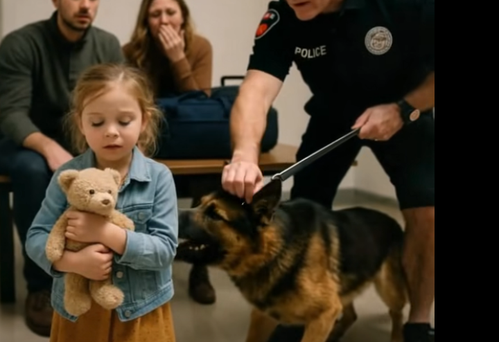 As the crowd passed, Bim suddenly froze in place. A young couple approached with their little girl, holding a teddy bear almost as big as she was. The dog’s gaze locked onto the toy, his body tense but controlled. The family’s documents and bags checked out normally, yet Bim remained focused. His unusual reaction drew curious looks from passengers nearby.