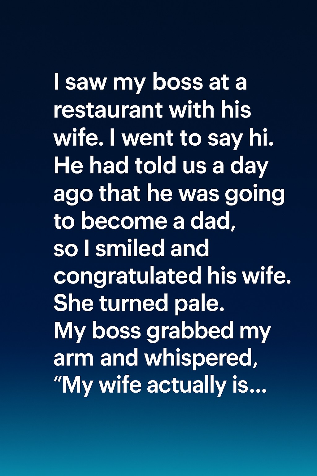 “I saw my boss at a restaurant with his wife. I went to say hi. He had told us a day ago that he was going to become a dad, so I smiled and congratulated his wife.” She froze at my words, her face draining of color. The clatter of cutlery and murmurs of surrounding diners suddenly receded into silence in my ears.