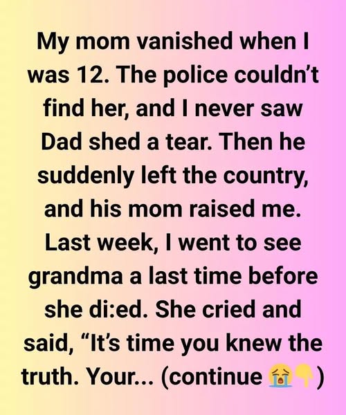 My mom vanished when I was 12. The police couldn’t find her, and I never saw Dad shed a tear. Then he suddenly left the country, and his mom raised me. Last week, I went to see Grandma one last time before she passed. She cried and said, “It’s time you knew the truth. Your mom didn’t leave—she was protecting you.” Her words hit me like a wave. For years, I had lived with unanswered questions, believing my mother had simply disappeared without a trace.