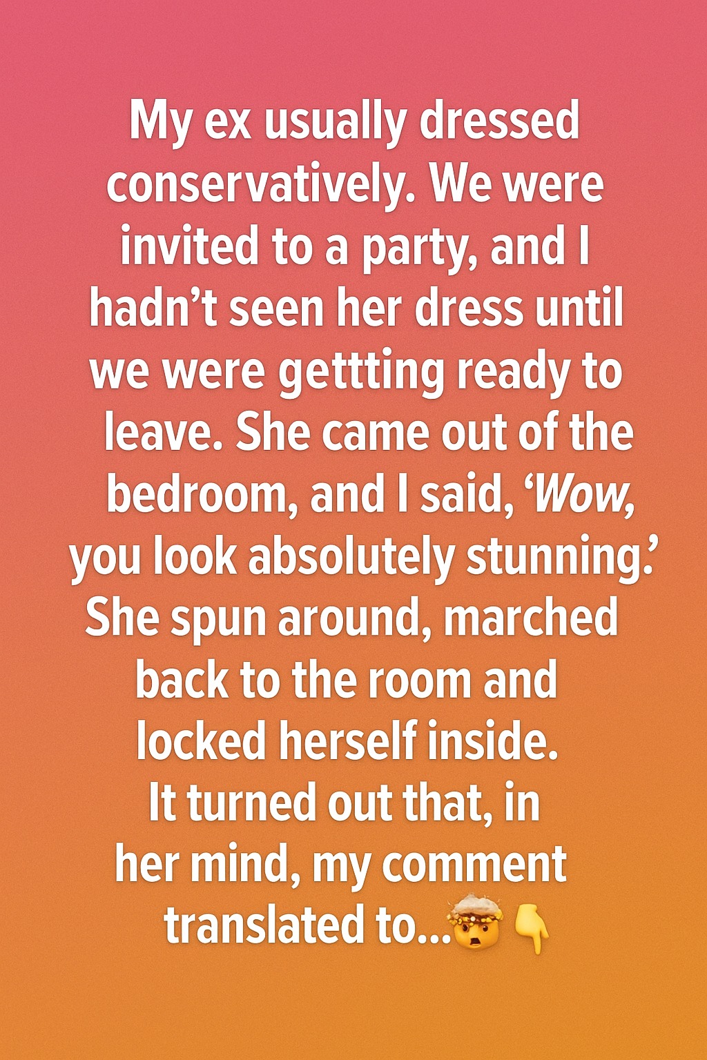 My ex usually dressed conservatively. We were invited to a party, and I hadn’t seen her dress until we were getting ready to leave. She came out of the bedroom, and I said, “Wow, you look absolutely stunning.” She spun around, marched back to the room, and locked herself inside.