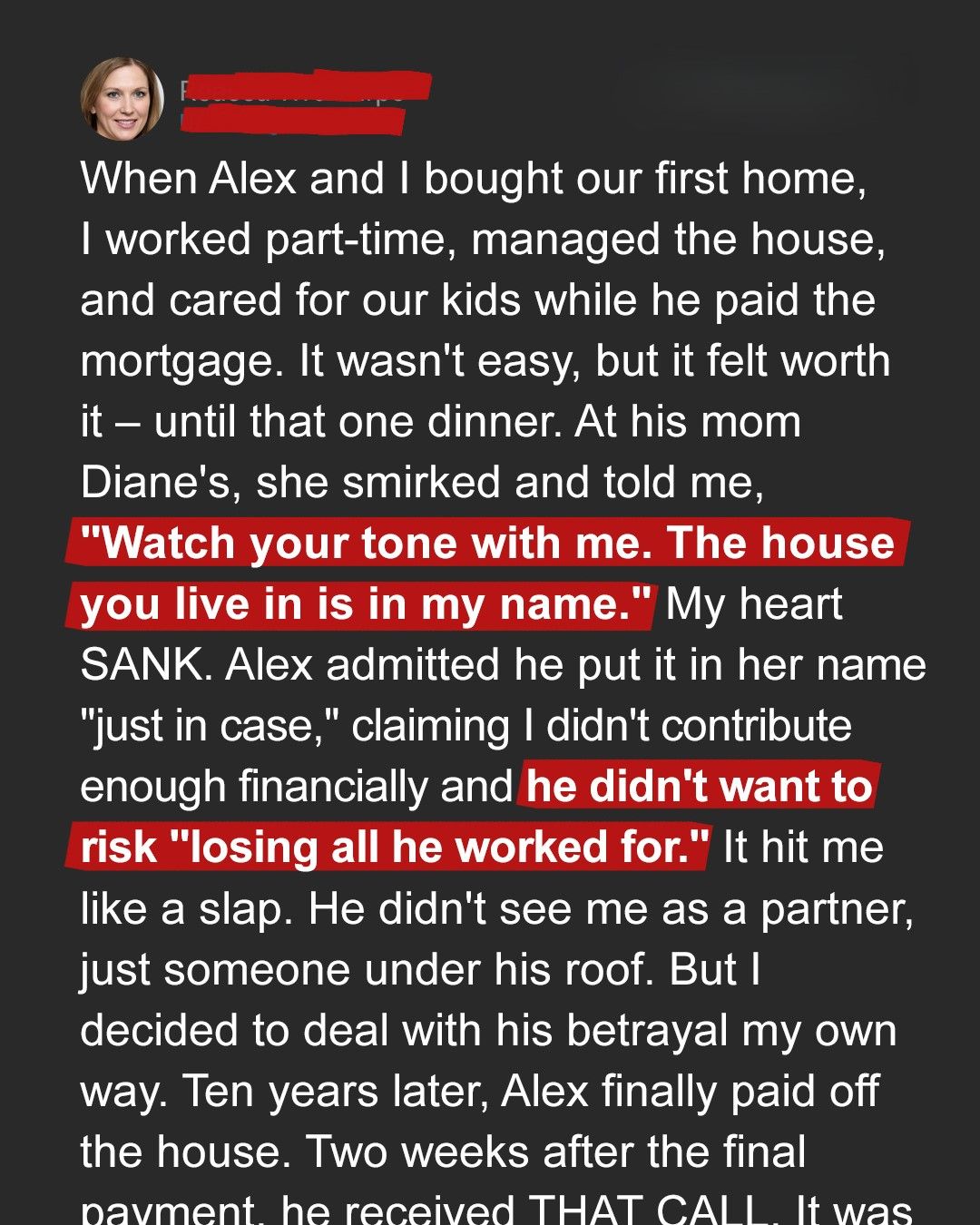 A decade passed, and Alex finally made the last mortgage payment. He was proud, believing the house was truly “theirs.” But karma had its own timeline. One evening, Diane called to inform Alex that she’d given the house to his sister, leaving him and his family with nowhere to go. His years of hard work had secured a house that no longer belonged to him. Panicked, Alex turned to Jennifer for help—only to discover she had quietly prepared for this day, saving money and arranging a safe place for herself and the kids.