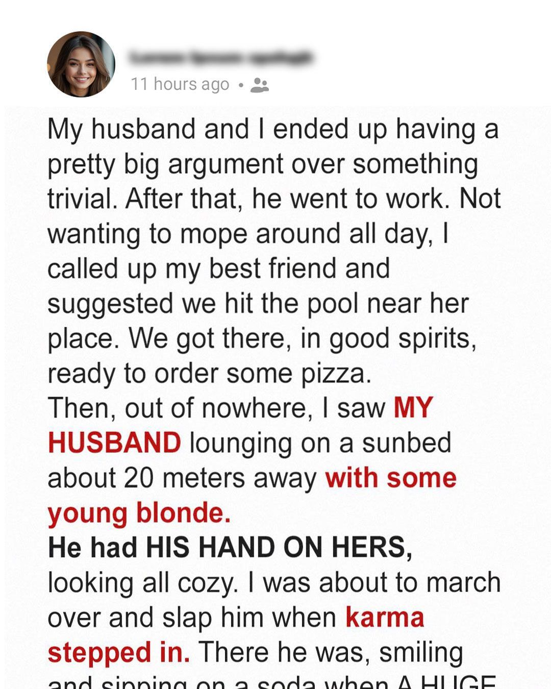 One sunny afternoon, hoping to clear my mind, I decided to spend the day at the pool with my best friend, May. The atmosphere was cheerful, and for a moment, I felt light again. But then, from across the pool, I saw Tom. He wasn’t alone. Sitting beside him was a young woman, and their closeness left little room for doubt. My heart raced, and a mix of disbelief and anger rushed through me. Before I could approach them, an unexpected confrontation unfolded between Tom and another man — the woman’s actual partner.