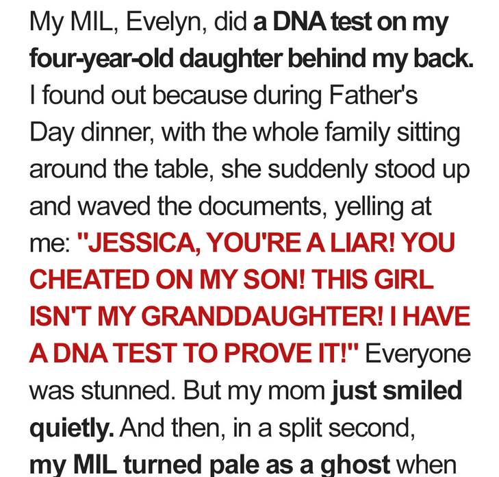 From the moment Jessica met James’s mother, Evelyn, she sensed trouble. Evelyn’s possessiveness was clear from the start, and over the years, her subtle remarks turned into sharper jabs—especially after Jessica and James welcomed their daughter, Willa. Evelyn often questioned the little girl’s features, making “jokes” that left quiet wounds. Distance helped for a while, but when Father’s Day brought both families together for dinner, years of tension finally boiled over.