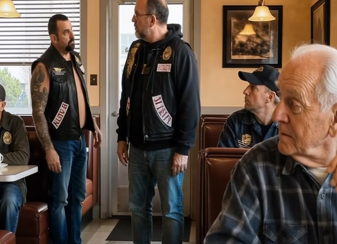 Minutes passed, and the regulars exchanged hushed words. The waitress brought Earl a fresh cup of coffee, her small nod offering silent support. The warmth of the diner returned slowly — until the doorbell chimed again. This time, it was Earl’s son, followed by a group of his friends. Their presence shifted the atmosphere instantly. They walked over, placing a steadying hand on Earl’s shoulder. No harsh words were needed. Their quiet solidarity spoke volumes.