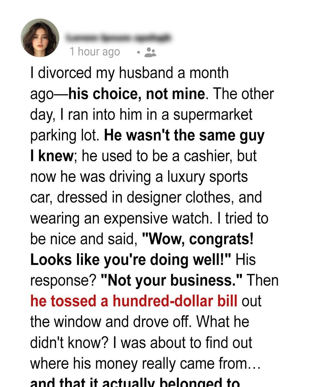 Katherine’s quiet life took a sharp turn the day she spotted a pristine white sports car in a supermarket parking lot — and out stepped Michael, her ex-husband. Once a modest grocery store cashier, he was now dressed in designer clothes, wearing a luxury watch, and exuding arrogance. Their divorce had been finalized just a month earlier, shortly after her grandfather passed away. When Katherine confronted him, Michael tossed a $100 bill at her with a smirk. As she picked it up, she noticed a small smiley face drawn on it — the exact mark she had made on one of the bills her grandfather once offered her before he died.