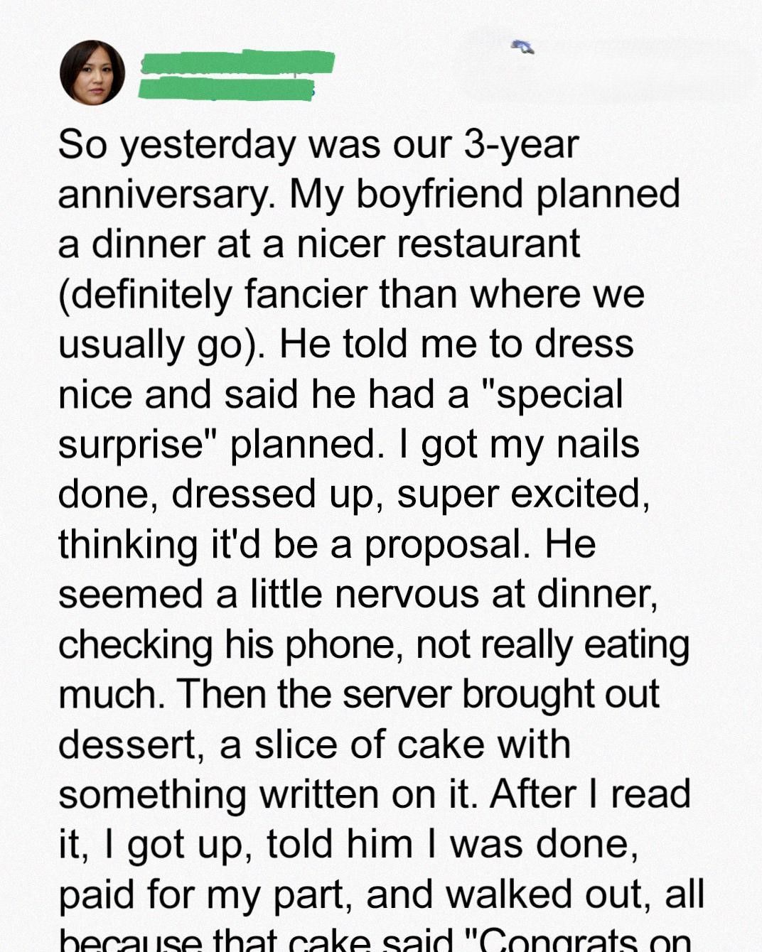 I spent years loving Ryan, certain he was “the one.” So when he planned a fancy anniversary dinner, I was sure it was finally happening—the proposal I’d dreamed of. I dressed up, feeling radiant in a green dress he once said made me look like a movie star. The evening felt magical at first—until dessert arrived. Instead of a ring, the waiter placed a cake that read, “Congrats on Your Promotion!”