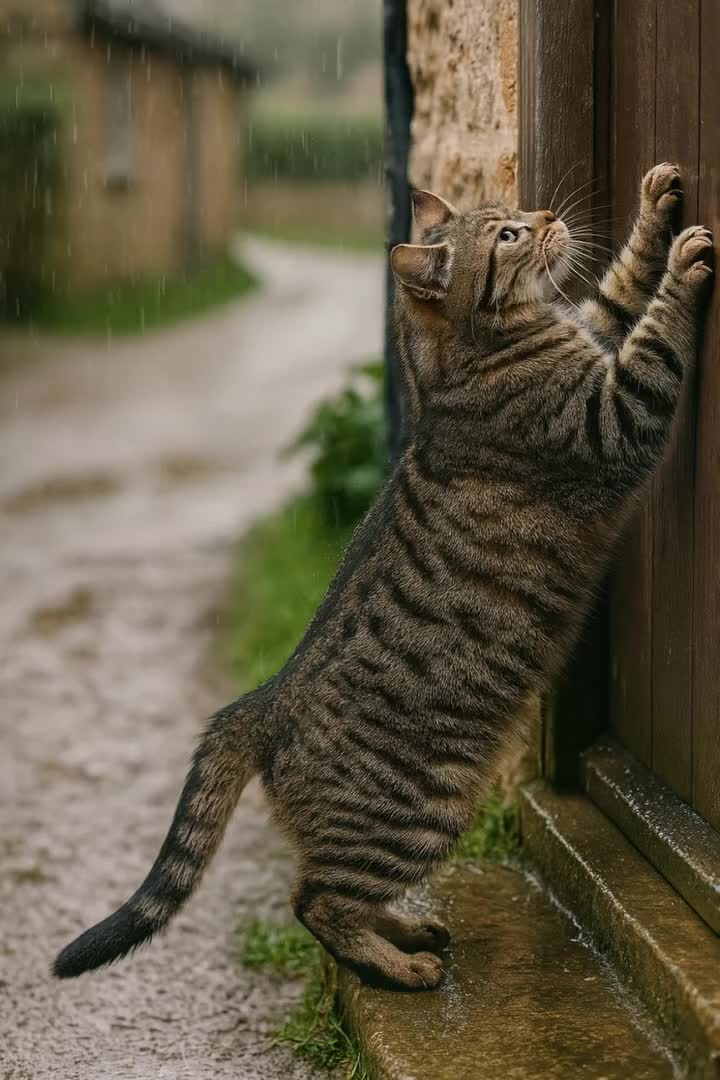 Outside, a heavy storm poured down, drenching the streets and silencing the town. Most people had taken refuge indoors, leaving the roads empty and dark. Amid the downpour, a soaked little cat appeared, her fur plastered to her thin body. She scratched frantically at a nearby door, her cries barely audible over the thunder. Inside, an elderly man sat quietly by the fire when he heard the faint sound.