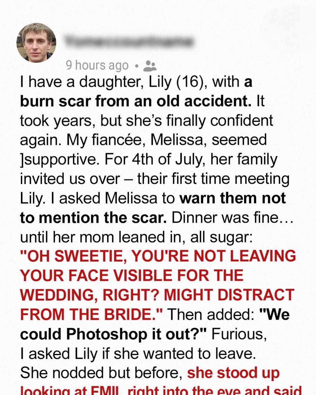 When my daughter Lily was 11, she went through a life-changing accident that left a visible scar across her forehead. Over the years, she learned to rebuild her confidence, and I stood by her every step of the way. By the time she reached her teens, she was stronger, braver, and ready to face the world again. When I met Melissa, she treated Lily kindly, and for the first time in a long while, I believed our little family was finally healing.