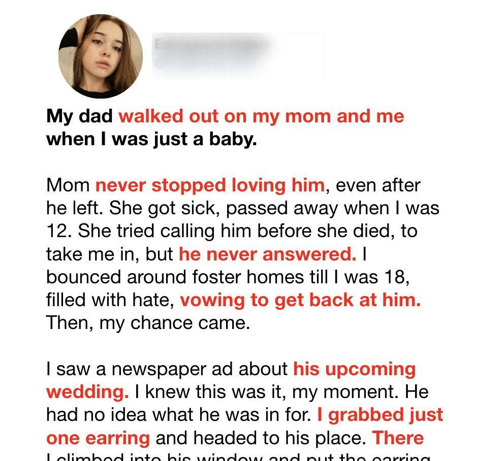 I went to the small town where he lived, holding just one of Mom’s earrings, her favorite. At first, I thought about confronting him, but when I saw him standing there—older, slower, surrounded by people who had no idea who I was—I couldn’t speak. Instead, I slipped the earring and a note into his mailbox. The note simply said, “From the daughter you once had.”