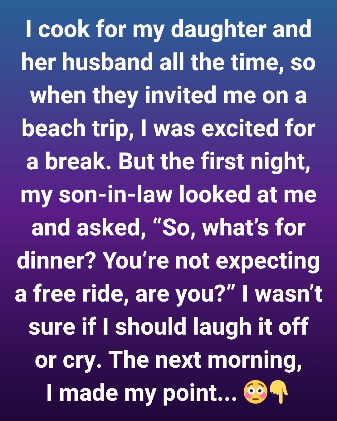 I love cooking for my daughter and her husband. Every Sunday, I bring over home-cooked meals — soups, casseroles, and her favorite lemon pie. So when they invited me on a beach trip, I was thrilled. I thought it was finally my turn to relax, to watch the waves and read a book without worrying about anyone’s dinner. But the first night, my son-in-law looked at me and said with a grin, “So, what’s for dinner? You’re not expecting a free ride, are you?”