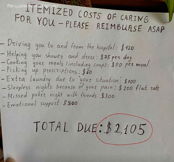 Three days after my surgery, when I was still recovering and moving slowly, I walked into the kitchen and noticed something taped to the refrigerator. At first, I thought it was a grocery list — until I saw the title written in my husband Daniel’s handwriting: “Expenses of Taking Care of You.” My heart sank as I read the list — each act of kindness he’d done during my recovery had been turned into a dollar amount. Every meal, every drive, even “emotional support.” At the bottom was the total: $2,105. I couldn’t believe the man I had shared my life with had reduced care into an invoice.