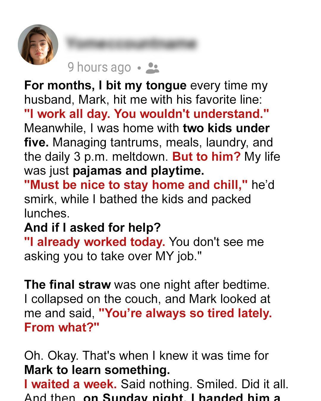 “I work all day. You wouldn’t understand.” Meanwhile, I was home with two kids under five — managing tantrums, meals, laundry, and the daily 3 p.m. meltdown. To him, my world looked like pajamas and playtime. “Must be nice to stay home and chill,” he’d say with a smirk, as I scrubbed dishes and packed lunches. And when I asked for help, he’d shrug. “I already worked today. You don’t see me asking you to take over my job.”