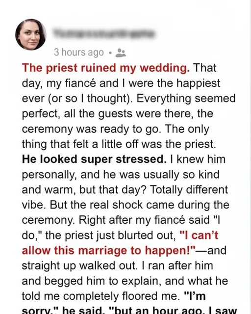 On the day of our wedding, everything felt magical. My fiancé and I were surrounded by family, friends, and so much joy. The decorations sparkled, the music was gentle, and excitement filled the air. However, I couldn’t help but notice that the priest seemed unusually tense. His smile felt forced, and his hands appeared slightly unsteady.