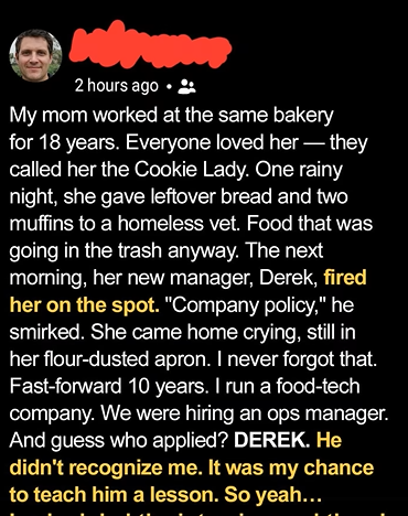 A decade passed, and life led me to build something meaningful: a food-tech startup focused on reducing waste and feeding those in need — the very principle my mother had stood for. We partnered with bakeries and restaurants to rescue unsold food and deliver it to shelters. One day, I reviewed applicants for a leadership role and saw a familiar name: Derek. Curious, I invited him for an interview. He walked in just as confident as I remembered, unaware of who I was. During the conversation, he proudly described how he once fired an “older woman” for giving away food, claiming it showed “discipline.” When he finished, I calmly told him: “That woman was my mother.” His expression shifted instantly. There was nothing more to say. I informed him that our company had no place for those who confused cruelty with strength.