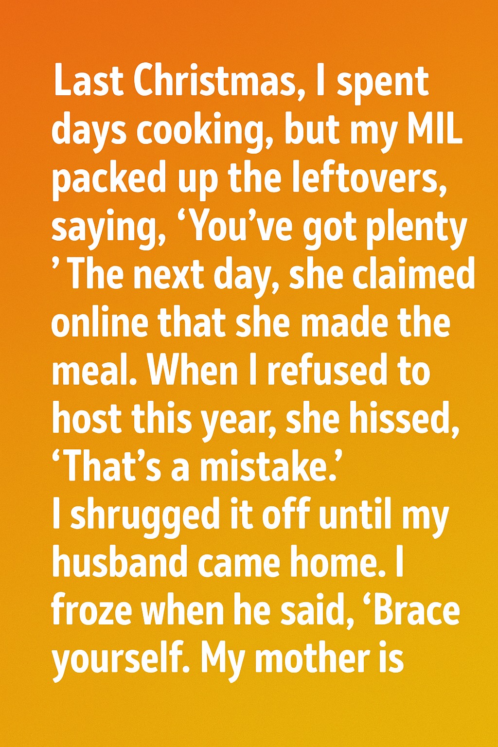 Last Christmas, I spent days cooking, but my MIL packed up the leftovers, saying, “You’ve got plenty.” The next day, she claimed online that she made the meal. When I refused to host this year, she hissed, “That’s a mistake.” I shrugged it off until my husband came home. I froze when he said, “Brace yourself. My mother is planning to host Christmas dinner at our house—with or without us.” The memory of last year’s exhaustion and quiet humiliation came rushing back. I had worked tirelessly to prepare a beautiful dinner, only to watch Linda take everything, both the food and the credit, without a thank you. I had hoped stepping back this year would be simple, but she had other plans.