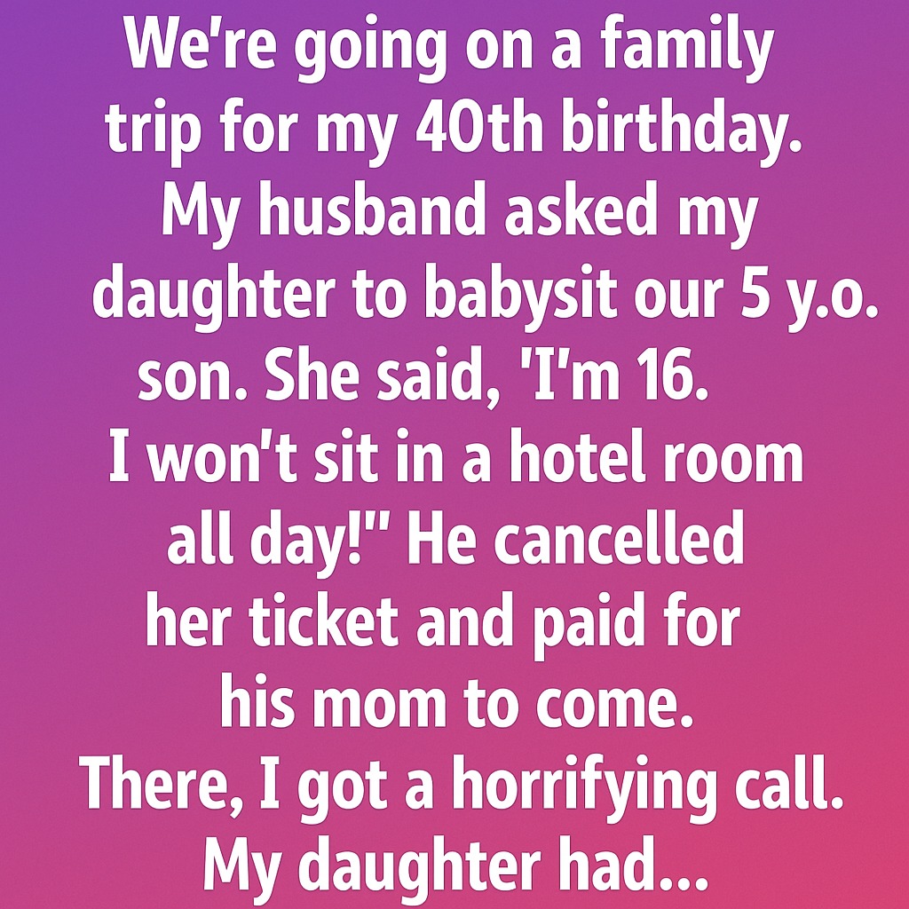 We’re going on a family trip for my 40th birthday. My husband asked my daughter to babysit our 5 y.o. son. She said, “I’m 16. I won’t sit in a hotel room all day!” He cancelled her ticket and paid for his mom to come. There, I got a horrifying call. My daughter had…collapsed from anxiety. She had a panic attack alone at home and a neighbor found her sitting on the porch, shaking and crying. When I got the call from the hospital, my heart dropped. I had no idea things had been that heavy for her. She felt rejected, excluded, and replaced—not just from the trip, but emotionally. She later told me she didn’t faint from illness, but from the overwhelming feeling that she wasn’t part of our “real family moment.”