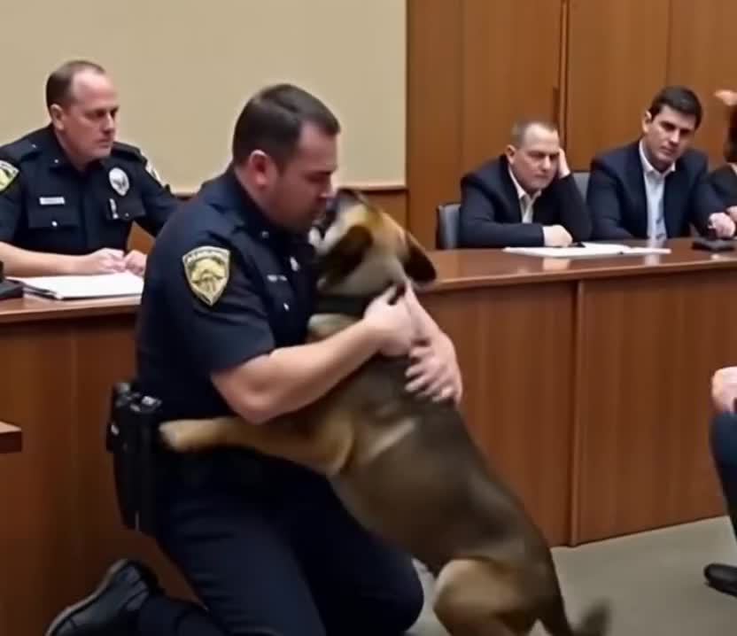 Moments later, the heavy courtroom doors opened, and Rex, a proud German shepherd with soft but alert eyes, walked in. Although he wore no badge now, he carried a dignity and loyalty only years of service could build. As soon as he saw Alex, Rex hurried to him, tail low and heart full. Alex fell to his knees, embracing his companion tightly. “I’m sorry,” he murmured, tears falling freely. “I did everything I could. I never betrayed anyone… but I couldn’t prove it.” Rex rested his head against Alex’s chest, sensing his pain and offering silent comfort.