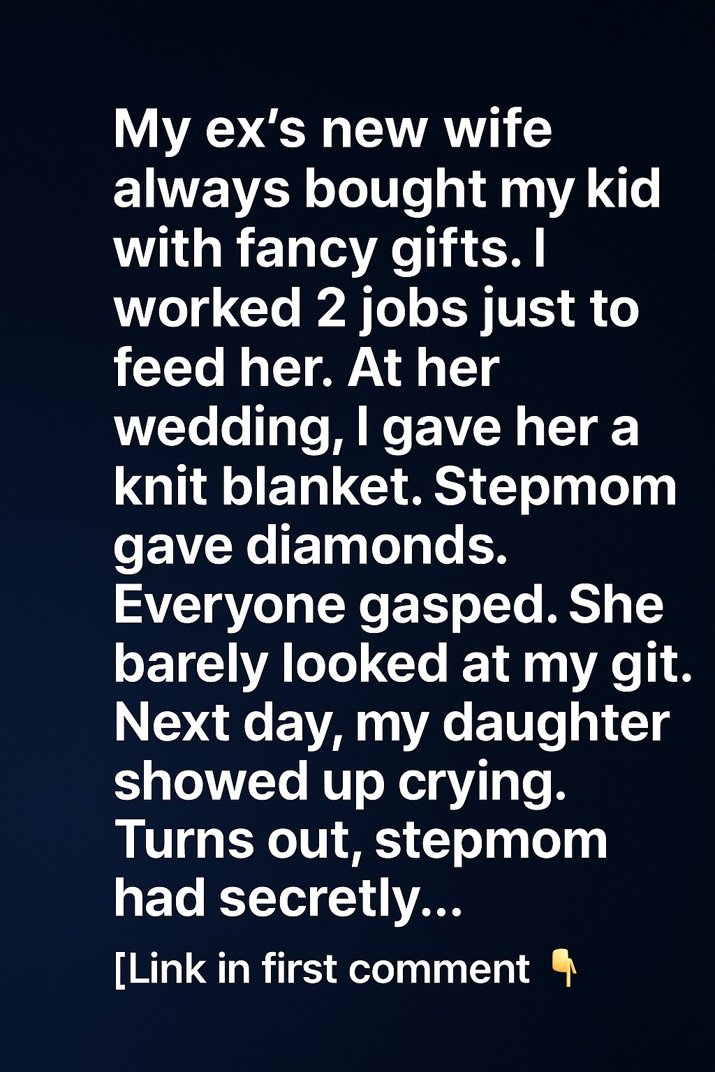 My ex’s new wife always bought my daughter expensive gifts — the latest phone, designer clothes, fancy jewelry. I worked two jobs just to keep food on the table, but I never complained. Love, not luxury, was what I wanted my child to remember. When my daughter got married, I spent months knitting a soft blanket with my own hands. It wasn’t glamorous, but every stitch carried a piece of my heart. At the wedding, her stepmother presented her with a sparkling diamond set. The guests applauded. My simple blanket looked out of place beside it.