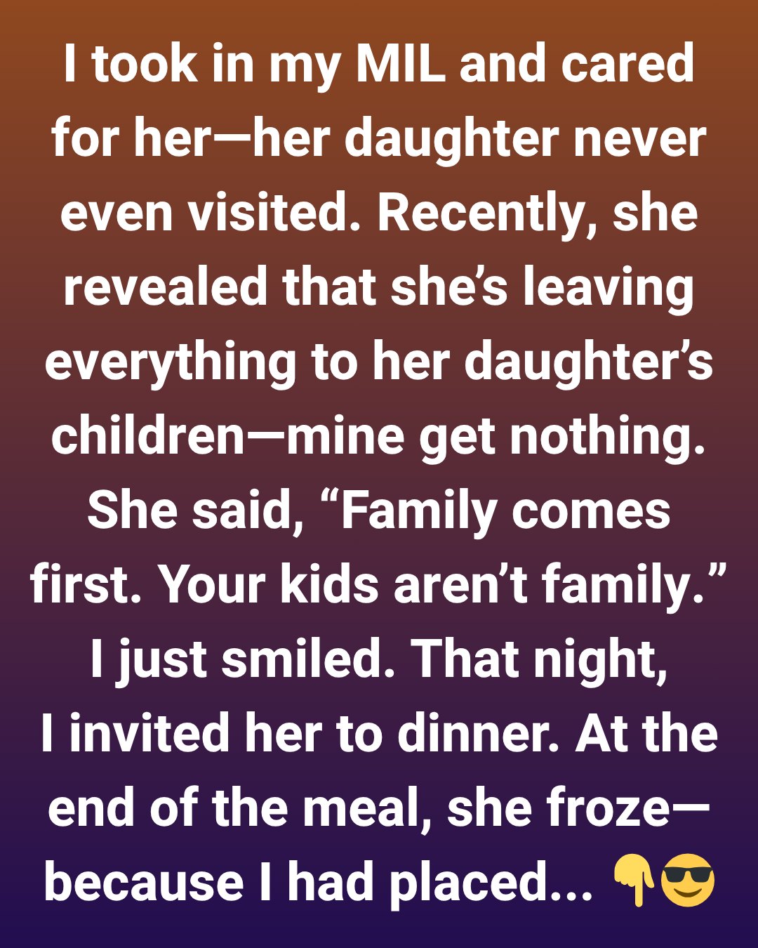 One afternoon, she casually mentioned she was leaving everything to her daughter’s children. Mine, she said, would receive nothing. “Family comes first,” she told me firmly. “And your children aren’t really family.” The words stung, but I kept calm. I reminded myself that kindness is never wasted, even when it isn’t acknowledged.