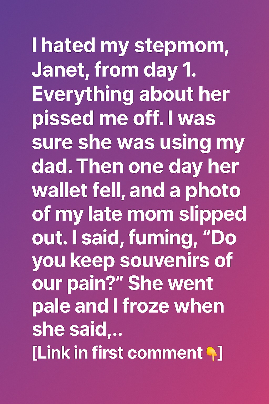 I hated my stepmom, Janet, from day one. Everything about her bothered me. I was sure she was only with my dad for his money. I shut her out, rolled my eyes at every attempt she made to bond, and convinced myself she could never respect my mother’s memory. Then one afternoon, her wallet fell from her purse at the grocery store, and a small photo of my late mom slipped out. Anger rushed through me as I picked it up. “Why do you have this?” I snapped, feeling betrayed.