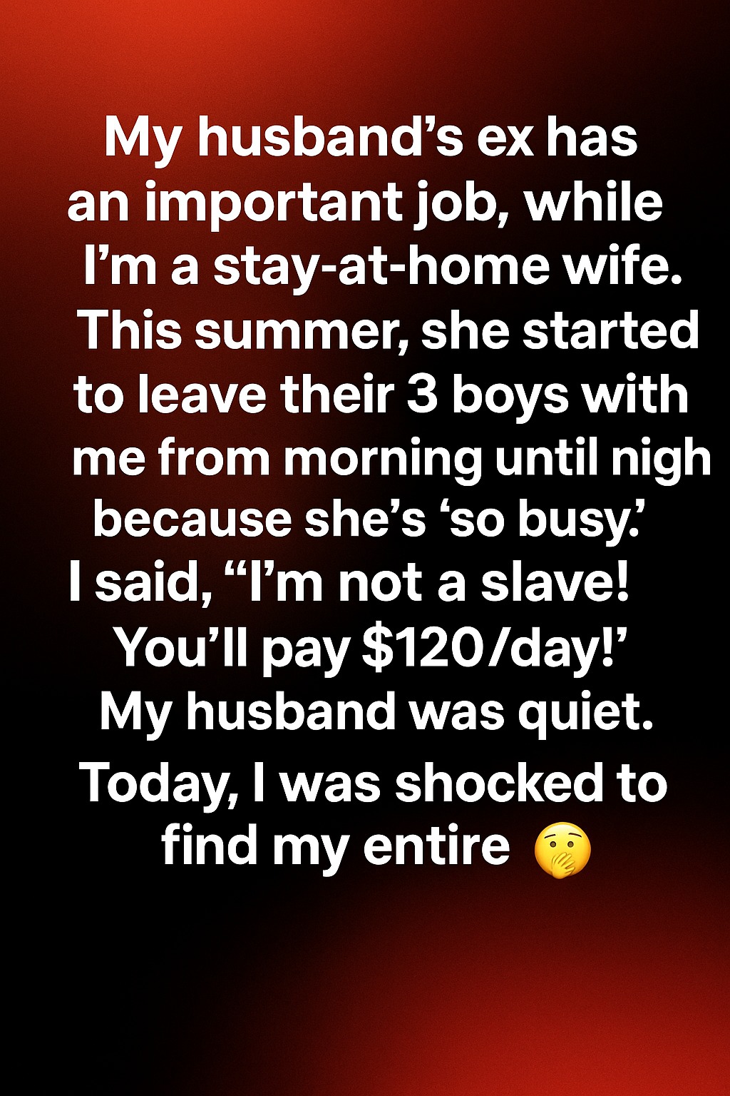 My husband’s ex began leaving their three boys with me every morning, saying her job kept her too busy. At first, I tried to help, telling myself it was temporary, but soon it felt like I was suddenly responsible for full-time childcare without agreeing to it. I care about the boys, but I also respect my own time and routines at home. Eventually, I found the courage to set a boundary and kindly explained that I couldn’t care for them every day unless we discussed compensation. I suggested a fair $120 a day so everyone understood that my time had value.