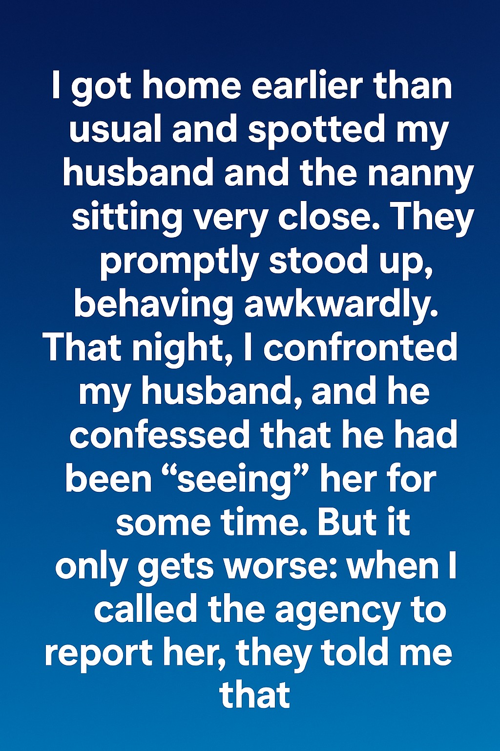 I got home earlier than usual and spotted my husband and the nanny sitting very close. They promptly stood up, behaving awkwardly. That night, I confronted my husband, and he confessed that he had been “seeing” her for some time. But it only got worse: when I called the agency to report her, they told me that she had already left her position there weeks ago without notice. That was when I realized I hadn’t just been betrayed — I had been living in a home built on secrets.
