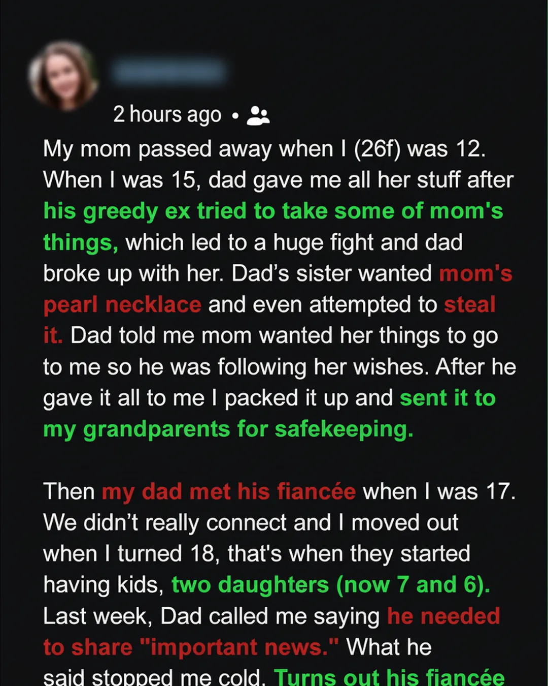 Last week, Dad called and said he had important news to share. His voice held a seriousness that made me pause. When we spoke, he explained that some of Mom’s belongings were being discussed again. His fiancée believed the girls should have a few heirlooms for their future. Hearing this left me quiet, unsure how to balance love, memory, and fairness.