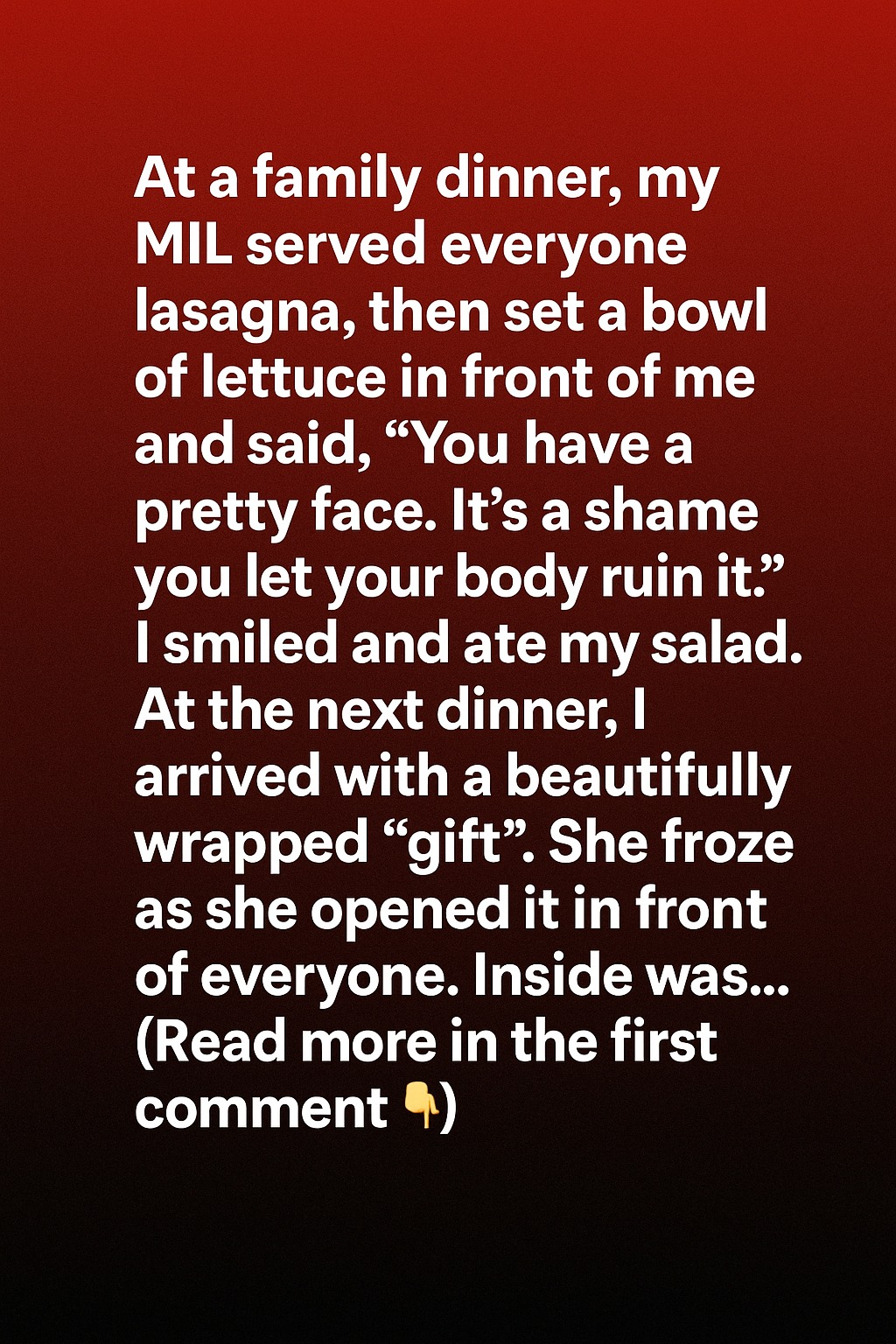 At a family dinner, my mother-in-law served everyone her famous lasagna while placing a small bowl of lettuce in front of me. With a polite smile, she commented on my appearance in a way that felt more hurtful than helpful. I swallowed my discomfort along with the salad, choosing not to respond. Still, her words stayed with me long after the meal ended. I decided that next time, I would stand up for myself with kindness, not confrontation.
