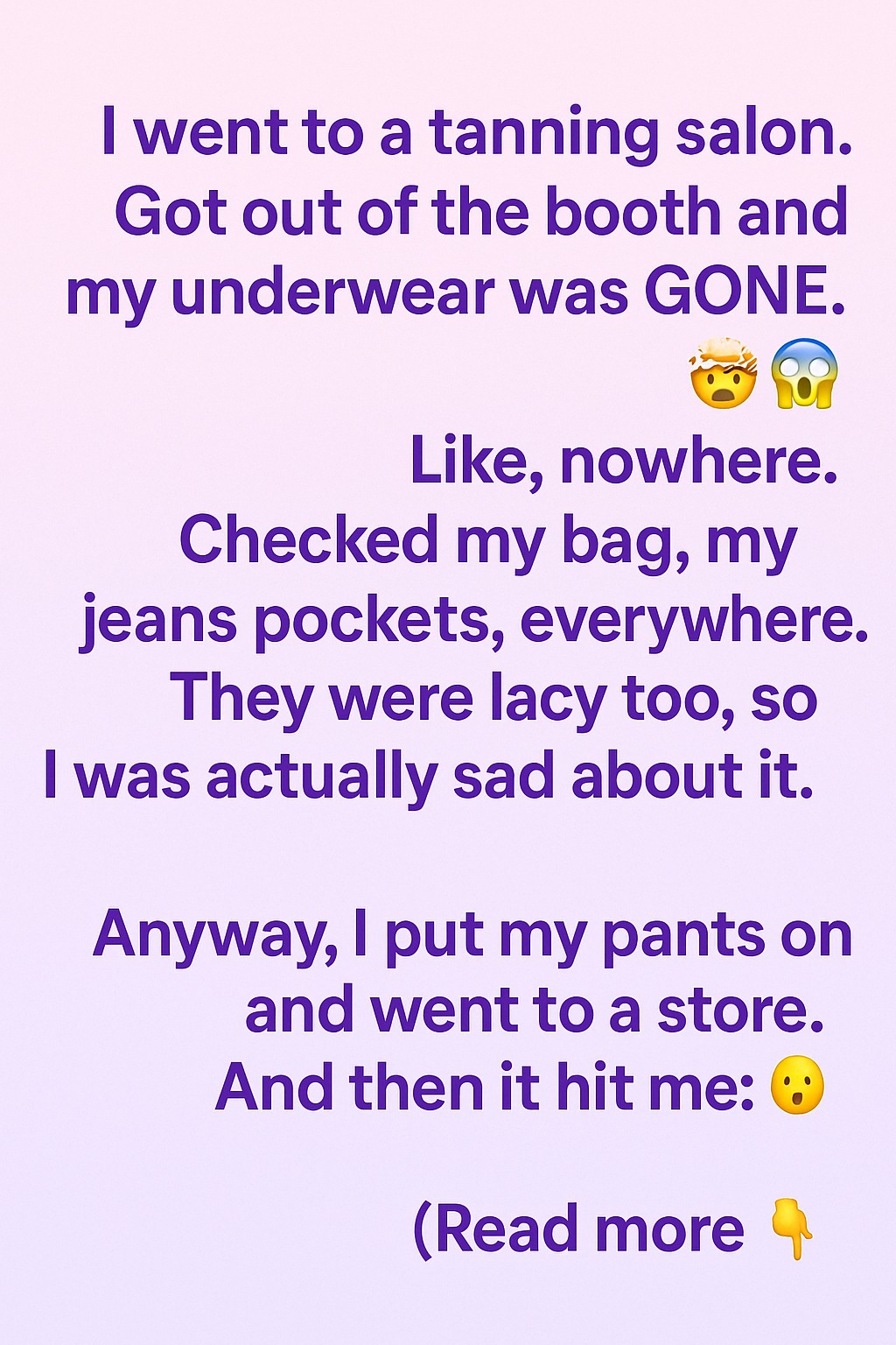 I went to a tanning salon. Got out of the booth and my clothing item was suddenly missing. It wasn’t in my bag, my pockets, or anywhere it should have been. I stood there completely confused, wondering how something could disappear in a closed room. It felt like a tiny mystery unfolding in the most unexpected place. So I put my jeans back on and carried on with my day.