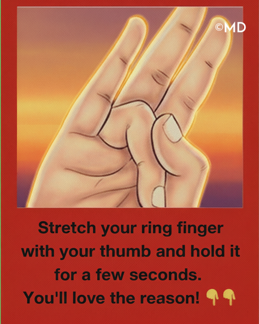 When you press and hold the base of the ring finger, you stimulate an area connected to hand mobility and tension relief. Ancient wellness practices often use similar pressure points to encourage calmness and balance in the body. Holding this stretch for a few seconds can help loosen stiff joints, improve circulation in the hand, and provide a small moment of relief that feels surprisingly refreshing. Many people say it’s like hitting a reset button after a busy day.