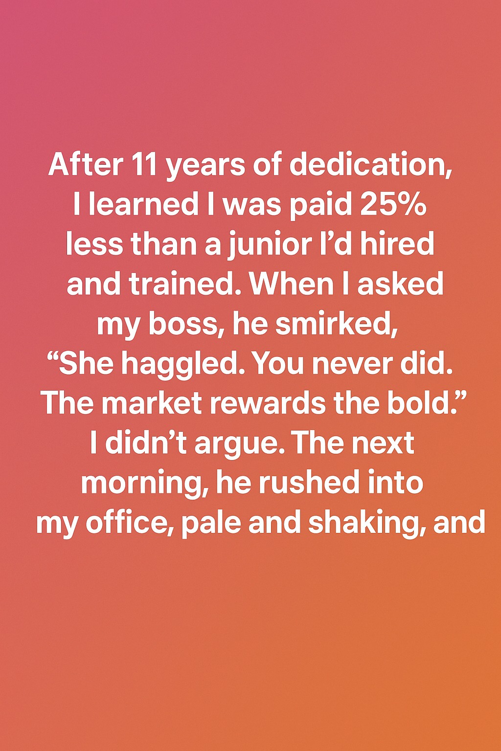 After 11 years of dedication, I learned I was paid 25% less than a junior I’d hired and trained. When I asked my boss, he smirked, “She haggled. You never did. The market rewards the bold.” I didn’t argue. The next morning, he rushed into my office, pale and shaking, and suddenly his confidence had disappeared. He explained that an internal audit team had arrived unexpectedly, reviewing compensation practices across the entire department.