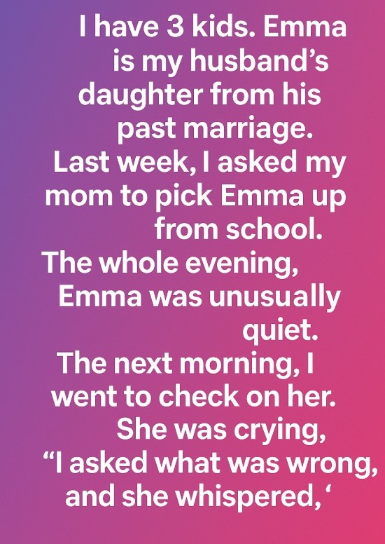 I have three children, and Emma is my husband’s daughter from his previous marriage. Our home has always been filled with laughter, routines, and the usual chaos that comes with raising kids, but last week something shifted. I had asked my mom to pick Emma up from school, thinking it would be just another ordinary day. That evening, however, Emma was unusually quiet. She stayed close by yet seemed lost in her thoughts. The next morning, when I went to check on her, I found her sitting on her bed with tears streaming down her face. When I asked what was wrong, she whispered that she felt like she didn’t fully belong.