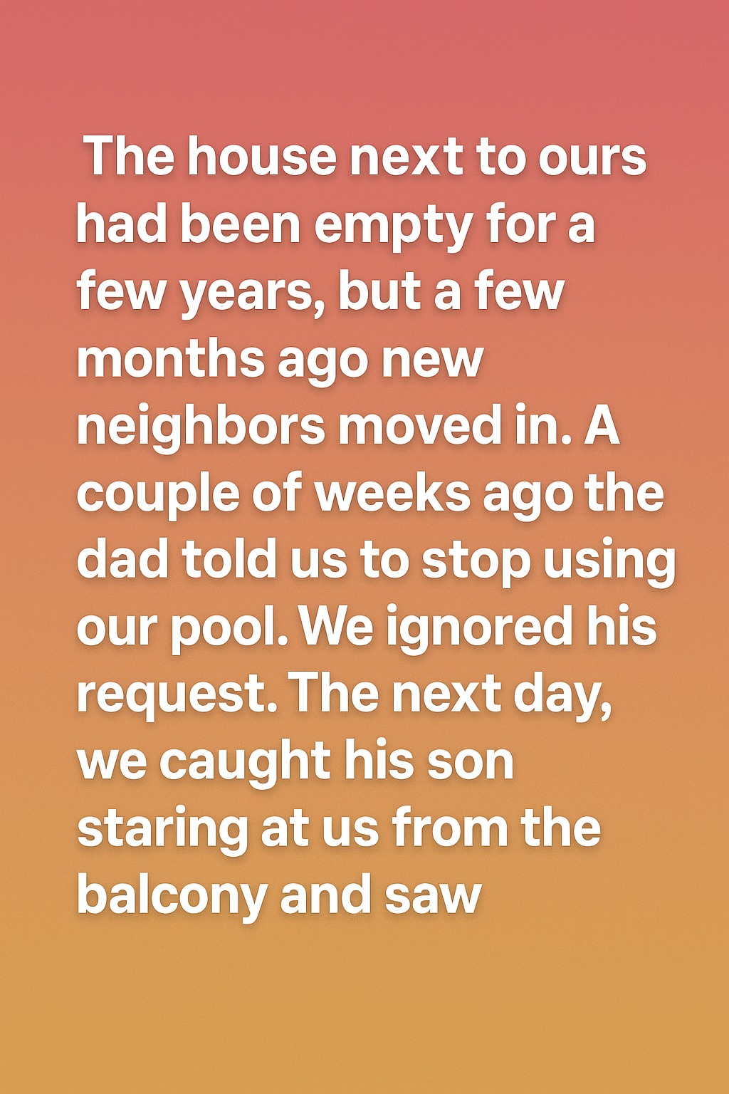 The house next to ours had been empty for a few years, but a few months ago new neighbors moved in. A couple of weeks ago the dad told us to stop using our pool. We ignored his request. The next day, we caught his son staring at us from the balcony and saw a look on his face that seemed more confused than upset, almost as if he was trying to understand why we were swimming there in the first place. At first, we brushed it off, thinking he was just curious about the neighborhood or trying to get used to his new surroundings. After all, moving into a new home after years of vacancy can be overwhelming, and people often need time to adjust. Still, it felt unusual that the father had told us to stop using something that clearly belonged to our property. We decided not to make a big deal of it, but the moment lingered in our minds longer than expected.