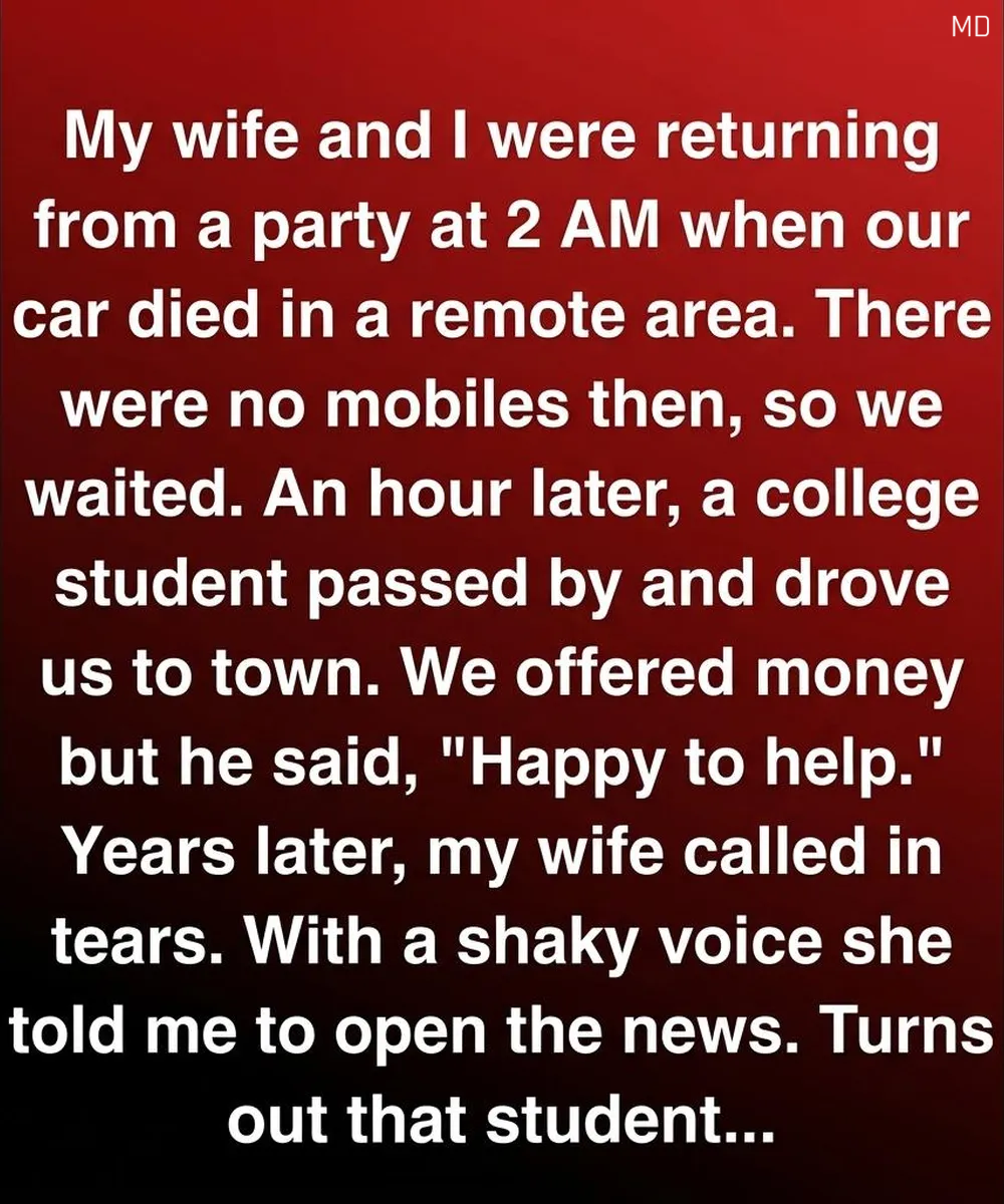 An hour passed before headlights appeared in the distance. A small, worn-out car pulled over, and a young man leaned across the passenger seat to ask if we were alright. He looked like a college student—tired eyes, a kind smile, and the sort of calm presence you don’t question. He drove us into town without hesitation. When we tried to offer him money, he shook his head gently and said, “Just help someone else when you can.” Then he drove off into the night, leaving behind nothing but gratitude we never quite forgot.