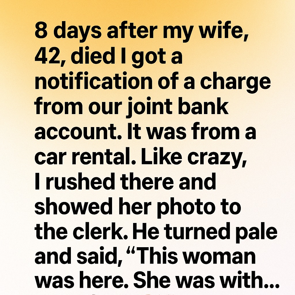 The notification came quietly, the way ordinary things do, and that was what made it unbearable. Eight days had passed since the funeral, eight days of learning how silence could have weight. When the charge appeared from the joint bank account—a car rental, of all things—it felt like a hand reaching out from a sealed room. Grief turned instantly into panic. I drove to the rental office on instinct alone, carrying her photo on my phone like proof against a mistake. I told myself there had to be an error, a delayed transaction, some boring explanation that would collapse under logic and let the world return to its rules.