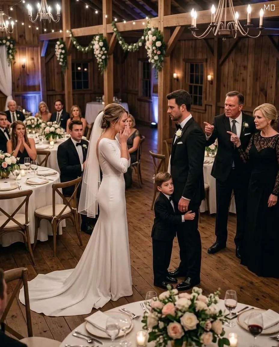 On what was meant to be a joyful wedding day, Maris Holloway stood beneath soft lights and quiet music, holding her young son Bennett’s hand as guests waited for the ceremony to begin. But the moment fractured when her parents arrived and, with cold detachment, spoke words that made a child feel unwelcome. Bennett didn’t understand every sentence, but he understood enough to shrink back in confusion. Maris froze—not from weakness, but from years of conditioning that had taught her silence was safer than resistance. Then Callum, her fiancé, stepped forward with calm determination, placing himself between them and gently shielding Bennett, making it clear that some lines could no longer be crossed.