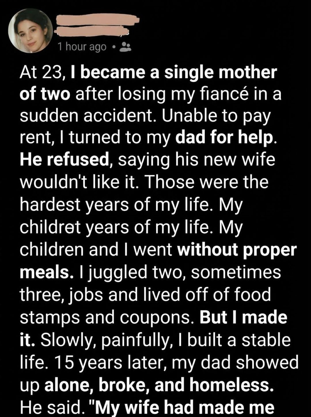 At twenty-three, my life changed in ways I could never have imagined. One moment, I was planning a future filled with shared dreams, and the next, I was facing the responsibility of raising two young children on my own after a sudden loss. Grief arrived quietly but stayed loudly, shaping every decision I made. Bills did not pause for sorrow, and responsibilities did not wait for healing. When the reality of rent, childcare, and daily expenses became overwhelming, I gathered the courage to ask my father for help. His refusal, though calm and brief, left a lasting ache—not just because of the struggle ahead, but because it made me realize how alone I truly was at that moment.