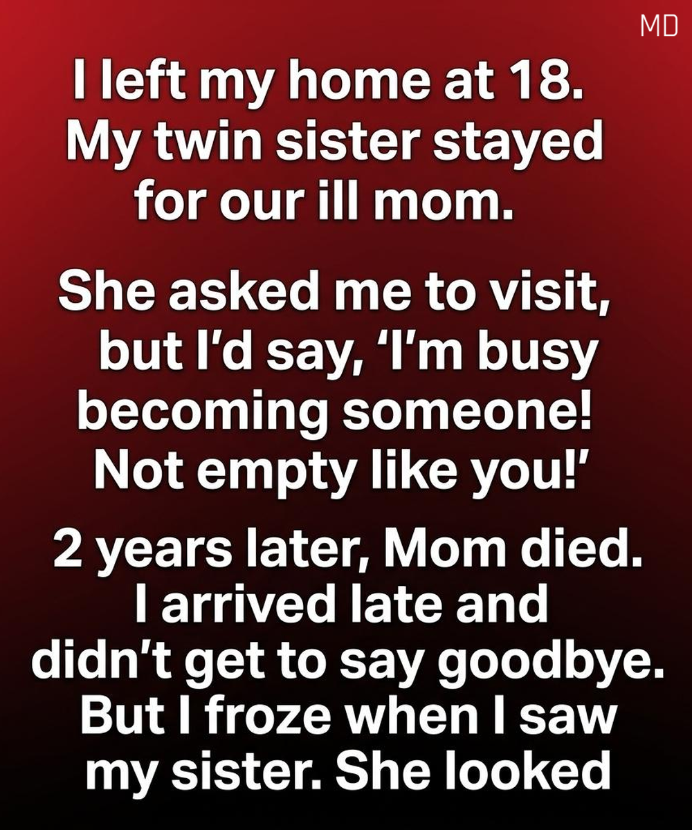 When I left home at eighteen with a suitcase, a scholarship, and endless ambition, I believed success meant building a life far away from where I started. My twin sister stayed behind, even though she had dreams of her own, because our mother’s health was already beginning to decline. She told me that caring for family mattered just as much as pursuing goals, but I dismissed her words with the confidence of someone too young to understand what truly matters. In my mind, leaving meant growth, and staying meant settling. I promised myself I would return when life was less busy—when I had achieved enough to make it all worthwhile.