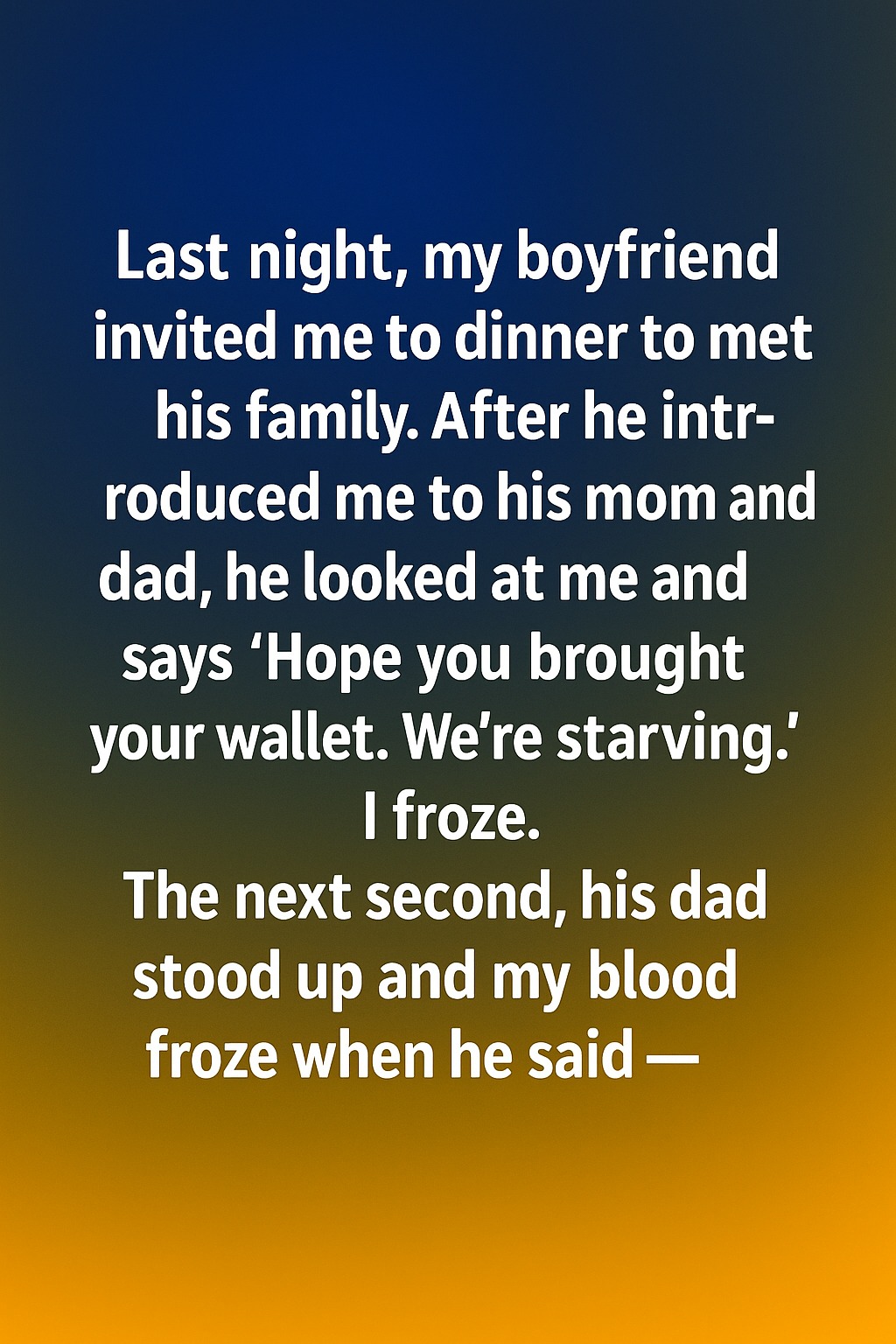 Last night, my boyfriend invited me to dinner to met his family. After he introduced me to his mom and dad, he looked at me and says ‘Hope you brought your wallet. We’re starving.’ I froze. The next second, his dad stood up and my blood froze when he said — “Don’t worry, we’re only teasing you.” The entire table burst into laughter, and I realized they were simply trying to break the ice, though their humor was far more intense than I expected. My face must have shown every emotion at once because my boyfriend quickly reached for my hand and assured me they meant no harm. Once the moment passed, his mom invited us to sit, eager to start dinner. The house smelled like warm bread and roasted vegetables, and soft music played in the background. Slowly, my nerves began to settle as his family started sharing stories from his childhood—stories he somehow never mentioned to me, especially the one about how he once tried to cook pasta without water.
