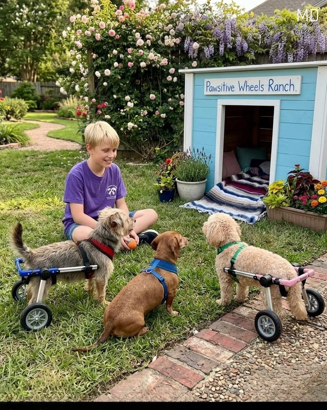 I always knew my twelve-year-old son, Ethan, had a remarkable heart. While other children walked past problems, he stopped to study them, determined to help. One evening, while driving home, we found three injured dogs lying beside the road, their back legs badly damaged and unable to move properly. We had little extra money and no clear plan, but leaving them there was never an option. We rushed them to the veterinarian, who explained that although the dogs would survive, they would likely never walk normally again. Ethan stood quietly for a moment, then looked at me with a seriousness beyond his years and said, “Don’t worry, Mom. I have an idea.” Over the next two weeks, our backyard turned into a workshop as he gathered old bike parts, stroller wheels, pipes, and scrap materials to build custom mobility carts for each dog.