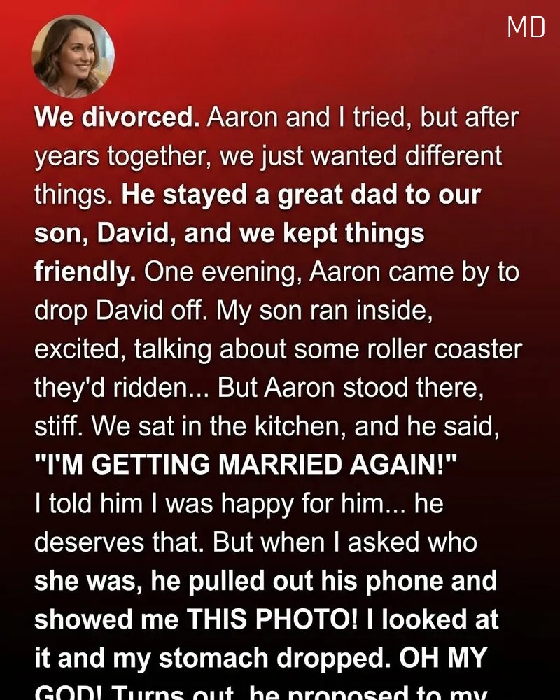 One evening, Aaron stopped by to drop David off after spending the day together. David rushed inside, full of excitement, talking nonstop about rides and laughter. I smiled, grateful that he was happy. But when I looked at Aaron, something felt different. He lingered at the door, unusually serious. We sat down in the kitchen, and after a brief pause, he shared that he was planning to get married again. I genuinely wished him well—he deserved happiness, just as I did. Still, there was a quiet curiosity in me about who this new person in his life might be.