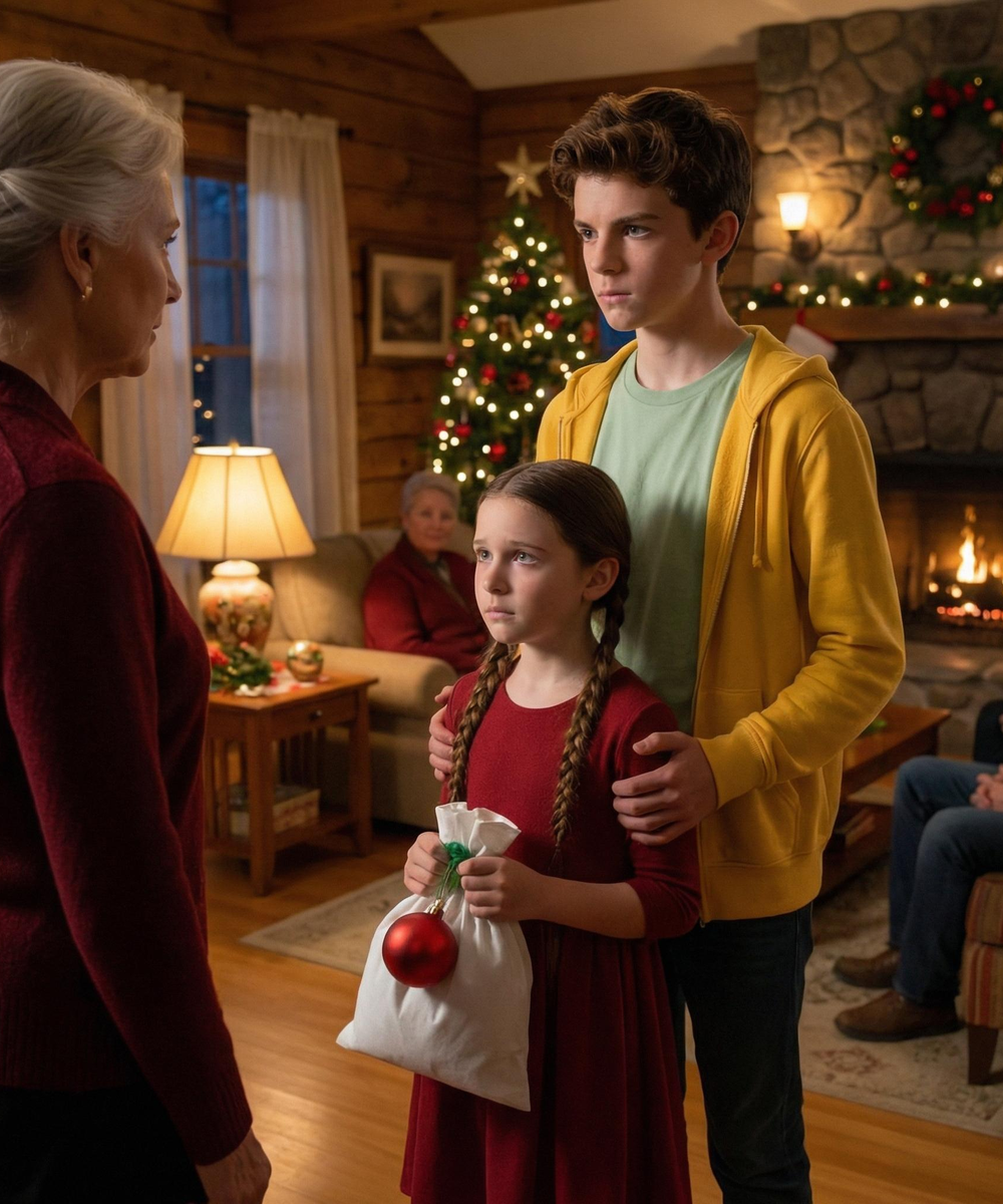 When it came time for gifts, Mia stepped forward, proud and hopeful, and handed Linda the ornament. Linda barely glanced at it before pushing it back. Her words weren’t loud, but they were sharp enough to silence the room. She implied—without explanation—that Mia didn’t belong, that some children didn’t earn certain titles. Mia froze, confusion replacing excitement. I moved to my daughter’s side, assuring her she had done nothing wrong, while the adults around us avoided eye contact. That was when Noah stood. He didn’t raise his voice or act out. He simply placed himself beside his sister, steady and protective, and said enough to make everyone listen. In that moment, the carefully maintained illusion of harmony shattered, and the room filled with a tension no one could ignore.