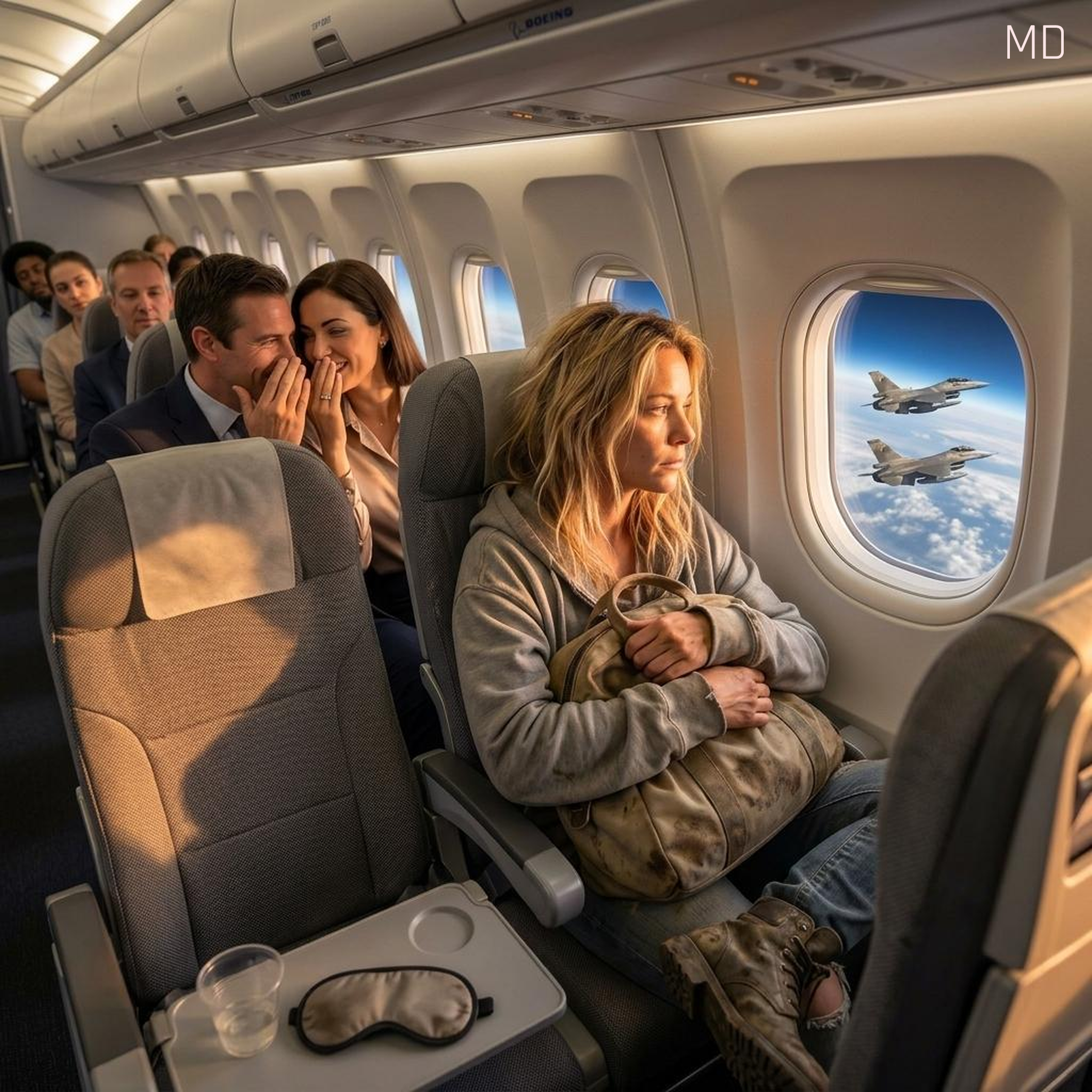 Despite the murmurs, the woman remained composed, showing no sign that she noticed the whispers. She rested comfortably, her stillness almost grounding amid the movement of the cabin. As the plane reached cruising altitude, the routine was suddenly interrupted by a brief but serious announcement from the cockpit. Passengers were asked to remain seated due to an unusual coordination request from air traffic control. The tone shifted immediately. Conversations faded, and a quiet tension replaced the earlier ease. Moments later, several passengers near the windows noticed something unexpected—fighter jets flying in close formation alongside the aircraft.