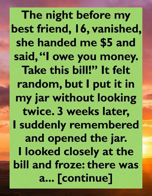 The night before my best friend, 16, vanished, she handed me $5 and said, “I owe you money. Take this bill!” It felt random, but I put it in my jar without looking twice. 3 weeks later, I suddenly remembered and opened the jar. I looked closely at the bill and froze: there was a small line of handwriting tucked into the white border near the portrait—so faint it looked like part of the texture. It wasn’t her usual bubbly script, but I recognized the way she wrote certain letters, sharp and hurried when she was anxious. The message was only three words: “Find the oak.” My breath caught. There was only one oak she ever talked about—the old tree behind the abandoned observatory where we used to sit during summer, watching bats flicker across the twilight sky. It was our secret spot. She hadn’t mentioned it in months, not since her parents’ arguing grew worse and she started withdrawing from everyone. Why would she hide a message in money? And why give it to me the night she vanished?