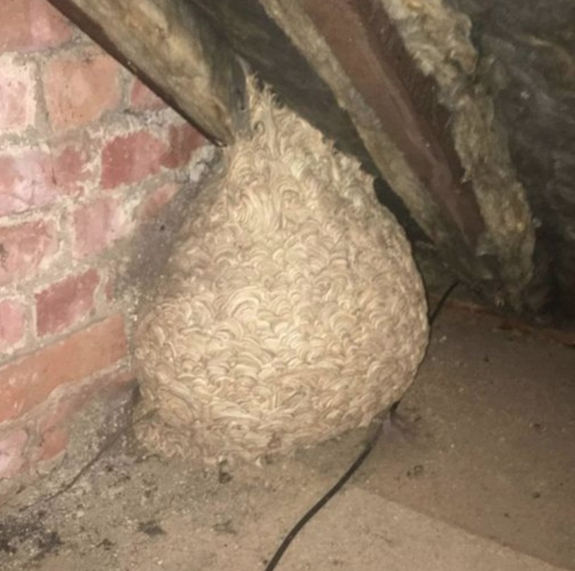 When the workers removed the last of the damaged arborvitae, they called James over to take a closer look. What he initially assumed was a simple piece of outdoor equipment turned out to be the opening to an unusually large insect nest attached to the outer wall of the shed. The structure was much larger than anything they had seen and produced a soft, continuous vibration that seemed to come from deep within. Concerned, James contacted several pest-control companies to inspect the nest. Each specialist gave the same advice: wait for winter when the nest would naturally become inactive. While the recommendation made sense from a safety standpoint, the family found it difficult to ignore the increasing buzzing sounds that echoed through the attic at night, creating uneasiness throughout the home.