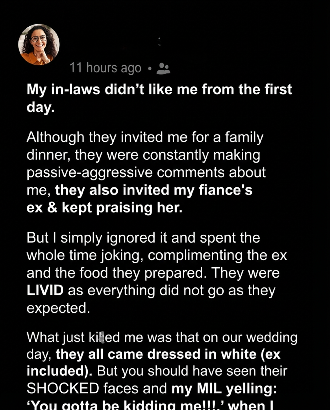 On our wedding day, as guests arrived and I prepared backstage, whispers began to reach me. When I finally stepped out, I saw it for myself—my in-laws, along with the ex, had all arrived dressed in white. The symbolism was impossible to miss, and the intention was unmistakable. For a brief moment, my heart sank. Then I took a deep breath and smiled. What they didn’t know was that my fiancé and I had already planned for surprises. This day was not about tradition or competition—it was about unity, confidence, and joy.